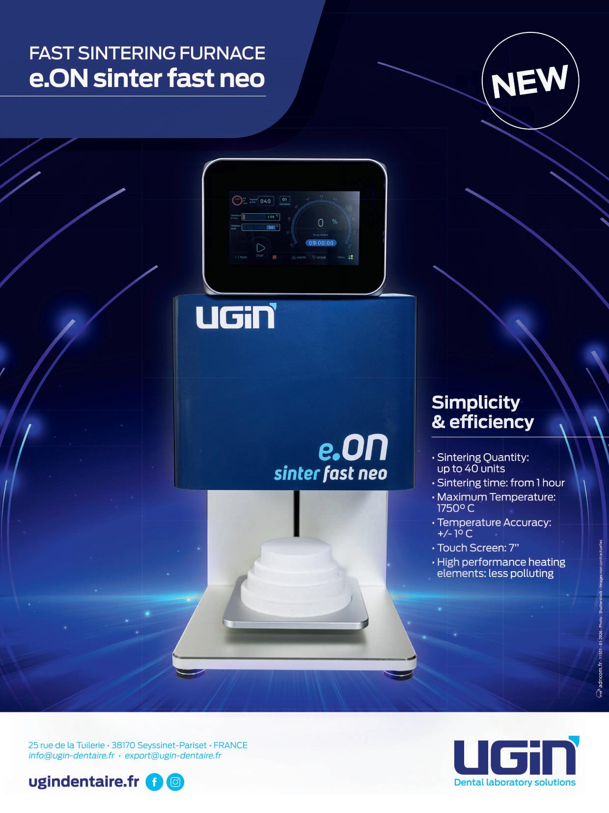 Ugin Dentaire is proud to announce the launch of the e.ON Sinter Fast Neo, a high-performance sintering furnace specifically designed to meet the needs of modern dental professionals. With its compact and contemporary design, the e.ON Sinter Fast Neo is the ideal solution for dental laboratories and clinics with limited space, making on-site sintering accessible even where it was previously not possible.