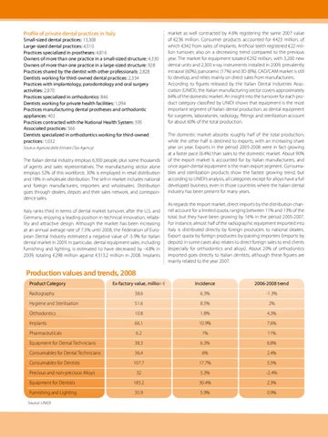 market as well contracted by 4.6% registering the same 2007 value of €236 million. Consumer products accounted for €423 million, of which €342 from sales of implants. Artificial teeth registered €22 million turnover, also on a decreasing trend compared to the previous year. The market for equipment totaled €292 million, with 3,200 new dental units and 2,300 x-ray instruments installed in 2009, prevalently intraoral (60%), panoramic (17%) and 3D (8%). CAD/CAM market is still to develop, and relies mainly on direct sales from manufacturers. According to figures released by the Italian Dental Industries Association (UNIDI), the Italian manufacturing sector covers approximately 64% of the domestic market. An insight into the turnover for each product category classified by UNIDI shows that equipment is the most important segment of Italian dental production, as dental equipment for surgeries, laboratories, radiology, fittings and sterilization account for about 60% of the total production. The domestic market absorbs roughly half of the total production, while the other half is destined to exports, with an increasing share year on year. Exports in the period 2005-2008 were in fact growing at a faster pace (6.4%) than sales to the domestic market. About 90% of the export market is accounted for by Italian manufacturers, and once again dental equipment is the main export segment. Consumables and sterilization products show the fastest growing trend, but according to UNIDI’s analysis, all categories except for alloys have a full developed business, even in those countries where the Italian dental industry has been present for many years. As regards the import market, direct imports by the distribution channel account for a limited quota, ranging between 11% and 13% of the total, but they have been growing by 16% in the period 2005-2007. For instance, almost half of the radiographic equipment imported into Italy is distributed directly by foreign producers to national dealers. Export quota by foreign producers by-passing importers (imports by depots) in some cases also relates to direct foreign sales to end clients (especially for orthodontics and alloys). About 20% of orthodontics imported goes directly to Italian dentists, although these figures are mainly related to the year 2007.