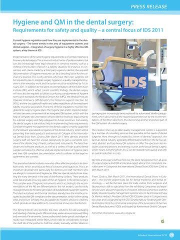 packaging are increasingly being replaced by automated labelling equipment, which document all the required parameters set by the recommendations of the RKI in label form, thus becoming another important part of the QM system of a dental surgery. The creation of an up-to-date quality management system is supported by a number of consulting services that specialise in the needs of dental surgeries. Here, through its “created by a team of dentists” approach, the German dental industry agreeably differentiates itself from the far too general, abstract and top-heavy QM systems on offer. The spectrum also includes coaching sessions and training courses at the actual dental surgery, which means everything from A to Z can be realised more quickly and with an overall reduction in costs. Dentists and surgery staff can find out the latest developments in all areas of surgery hygiene and QM and receive expert advice from competent manufacturers in Cologne at the International Dental Show (IDS) from 22nd to 26th March 2011. “From 22nd to 26th March 2011, the International Dental Show in Cologne— the world’s largest trade fair for dental medicine and dental technology — will be the best place for trade visitors from surgeries and laboratories to talk to specialists from the exhibiting companies and experienced users about the spectrum of modern infection prevention and the legally required quality management systems soon to be introduced,” says Dr. Markus Heibach, President of the VDDI. IDS takes place in Cologne every two years and is organized by the GFDI Gesellschaft zur Förderung der Dental-Industrie mbH, the commercial enterprise of the Association of German Dental Manufacturers (VDDI) and staged by Koelnmesse GmbH, Cologne. For further information: www.ids-cologne.de