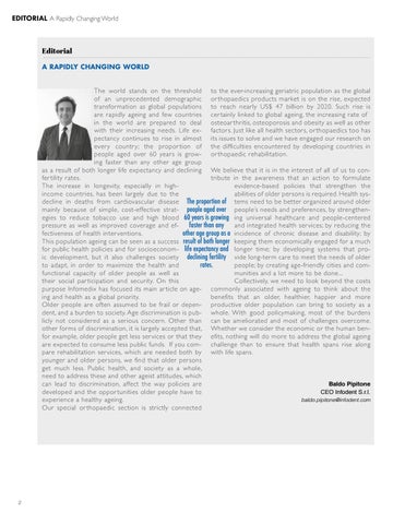 a rapidly changing world The world stands on the threshold to the ever-increasing geriatric population as the global of an unprecedented demographic or thopaedics products market is on the rise, expected transformation as global populations to reach nearly US$ 47 billion by 2020. Such rise is are rapidly ageing and few countries cer tainly linked to global ageing, the increasing rate of in the world are prepared to deal osteoar thritis, osteoporosis and obesity as well as other with their increasing needs. Life ex- factors. Just like all health sectors, or thopaedics too has pectancy continues to rise in almost its issues to solve and we have engaged our research on ever y countr y; the propor tion of the difficulties encountered by developing countries in people aged over 60 years is grow- or thopaedic rehabilitation. ing faster than any other age group as a result of both longer life expectancy and declining We believe that it is in the interest of all of us to confer tility rates. tribute in the awareness that an action to formulate The increase in longevity, especially in highevidence-based policies that strengthen the income countries, has been largely due to the abilities of older persons is required. Health sysdecline in deaths from cardiovascular disease The proportion of tems need to be better organized around older mainly because of simple, cost-effective strat- people aged over people’s needs and preferences, by strengthenegies to reduce tobacco use and high blood 60 years is growing ing universal healthcare and people-centered pressure as well as improved coverage and effaster than any and integrated health ser vices; by reducing the fectiveness of health inter ventions. other age group as a incidence of chronic disease and disability; by This population ageing can be seen as a success result of both longer keeping them economically engaged for a much for public health policies and for socioeconom- life expectancy and longer time; by developing systems that proic development, but it also challenges society declining fertility vide long-term care to meet the needs of older to adapt, in order to maximize the health and people; by creating age-friendly cities and comrates. functional capacity of older people as well as munities and a lot more to be done... their social par ticipation and security. On this Collectively, we need to look beyond the costs purpose Infomedix has focused its main ar ticle on age- commonly associated with ageing to think about the ing and health as a global priority. benefits that an older, healthier, happier and more Older people are often assumed to be frail or depen- productive older population can bring to society as a dent, and a burden to society. Age discrimination is pub- whole. With good policymaking, most of the burdens licly not considered as a serious concern. Other than can be ameliorated and most of challenges overcome. other forms of discrimination, it is largely accepted that, Whether we consider the economic or the human benfor example, older people get less ser vices or that they efits, nothing will do more to address the global ageing are expected to consume less public funds. If you com- challenge than to ensure that health spans rise along pare rehabilitation ser vices, which are needed both by with life spans. younger and older persons, we find that older persons get much less. Public health, and society as a whole, need to address these and other ageist attitudes, which Baldo Pipitone can lead to discrimination, affect the way policies are CEO Infodent S.r.l. developed and the oppor tunities older people have to baldo.pipitone@infodent.com experience a healthy ageing. Our special or thopaedic section is strictly connected