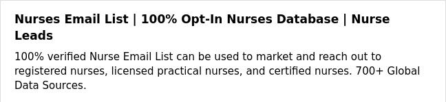 With our CASS-certified Registered Nurses Email List, you can take your nurse marketing strategy to the next level. Given the global deficit of experienced and certified nurses and the concurrent demand for them across many medical industries, acquiring wellverified Nurses Mailing Lists will assist marketers in meeting business possibilities and market demands quickly.