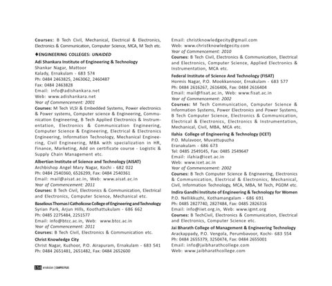 Courses: B Tech Civil, Mechanical, Electrical & Electronics, Electronics & Communication, Computer Science, MCA, M Tech etc. ENGINEERING COLLEGES: UNAIDED Adi Shankara Institute of Engineering & Technology Shankar Nagar, Mattoor Kalady, Ernakulam - 683 574 Ph: 0484 2463825, 2463062, 2460487 Fax: 0484 2463828 Email: info@adishankara.net Web: www.adishankara.net Year of Commencement: 2001 Courses: M Tech VLSI & Embedded Systems, Power electronics & Power systems, Computer science & Engineering, Communication Engineering, B Tech Applied Electronics & Instrumentation, Electronics & Communication Engineering, Computer Science & Engineering, Electrical & Electronics Engineering, Information Technology, Mechanical Engineering, Civil Engineering, MBA with specialization in HR, Finance, Marketing, Add on certificate course - Logistic & Supply Chain Management etc. Albertian Institute of Science and Technology (AISAT) Archbishop Angel Mary Nagar, Kochi - 682 022 Ph: 0484 2540360, 6526299, Fax: 0484 2540361 Email: mail@aisat.ac.in, Web: www.aisat.ac.in Year of Commencement: 2011 Courses: B Tech Civil, Electronics & Communication, Electrical and Electronics, Computer Science, Mechanical etc. Baselious Thomas I Catholicose College of Engineering and Technology Syrian Park, Arjun Hills, Koothattukulam - 686 662 Ph: 0485 2275484, 2251577 Email: info@btcc.ac.in, Web: www.btcc.ac.in Year of Commencement: 2011 Courses: B Tech Civil, Electronics & Communication etc. Christ Knowledge City Christ Nagar, Kuzhoor, P.O. Airapuram, Ernakulam - 683 541 Ph: 0484 2651481, 2651482, Fax: 0484 2652600 156 ernakulam