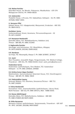 K.B. Mohan Panicker Kalarikkal House, Sai Mandir, Pidavannur, Mookkuthala - 679 574 Malappuram District, Ph: 94464 88326 K.K. Sadanandan Thadathil House, L.P.S.Lane, P.O. Vadavathoor, Kottayam - 10, Ph: 0481 2575640, 94467 15031 K. Narayana Pillai Kattayil House, P.O. Udyogamandal, Manjummel, Ernakulam - 683 501 Ph: 98474 54711 Kovilakam Varma Sankarasubhayer Street, Karamana, Thiruvananthapuram - 02 Ph: 0471 2343597 K.P. Narayanan Namboodiri Kaimukku Mana, P.O. Mattathoorkunnu, Kodakara (via) Thrissur - 680 684, Ph: 0480 2723443 K. Reghunatha Panicker Astrologer and Astronomer, P.O. Mavelikkara, Alleppey Ph: 0479 2342878, 2415340, 93494 64102 K.R. Nandanan Sai Kripa, P.O. Marampally, Alwaye-7, Ph: 0484 2678497, 2679417 K.S. Sastri Devi Prasadam, Janasakthi Nagar, Pongummoodu, P.O. Medical College, Trivandrum - 695 011, Ph: 94463 82329, Email: sastri_astro@yahoo.co.in Kudamaloor Sarma Kudamaloor Jyothishalayam, Pare Madom, P.O. Kudamaloor Kottayam - 17, Ph: 0481 2393634, 2393683 K.V. Krishna Kumar (Appu Panicker) Mashinottam, Kannanamkulam Kalarickal House, P.O. Chenthrappinni Thrissur - 680 687, Ph: 98462 39619 K.V. Padmanabhan Swamy Karanayil Madom, P.O. Ettumana, Karuvannur,Thrissur - 680 711 Ph: 0487 2342693 K. Vishnu Namboodiri Kunnathoor Illam, Sreemookambika Jyothishalayam, Library Road, North Paravoor - 683 513, Ph: 0484 2447271, Mob - 93886 05541 K.V. Raman Akkithirippad Kaimukku Mana, P.O. Mattathurkunnu, Kodakara - 680 684 Ph: 0480 2720835 (M) 94470 20835 M. Shibu Narayanan Narayana Vilasam Jyothishalayam, Venjaramoodu, Trivandrum - 695 607 Ph : 0472 2872687, 2832388, 94470 60587