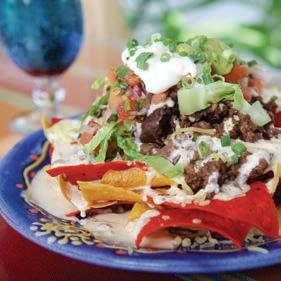 2 crunchy corn or flour tortilla shells with lettuce, salsa and Cheddar, loaded with your choice of filling, then topped with sour cream and guacamole, served with Spanish rice and refried beans