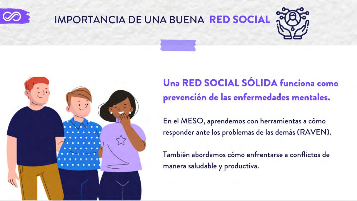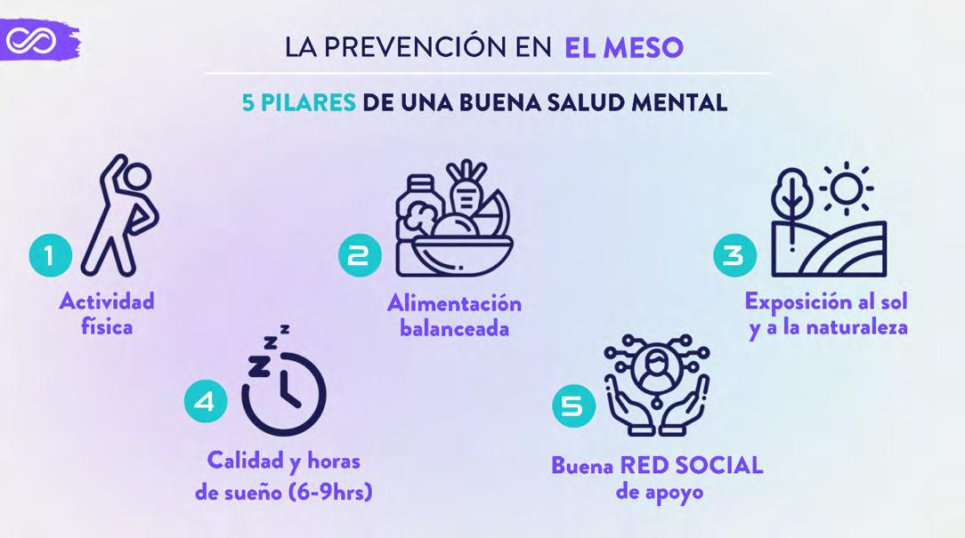 Lo que ofrecemos en el Meso es una prevención para tener una buena salud mental, como lo hemos mencionado antes, la salud física y mental están entrelazadas así que para prevenir las enfermedades mentales enseñamos estos 5 pilares.