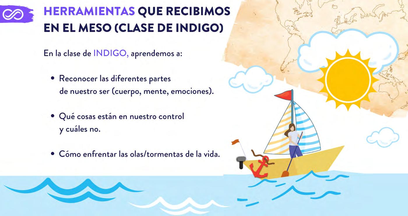 En las clases de Indigo, aprendemos a reconocer las partes de nuestro ser: los dos hemisferios diferentes de nuestro cerebro (uno emocional y el otro lógico), cómo funcionan nuestros pensamientos y nuestro cerebro en general, aprendemos a reconocer las cosas que estén en nuestro control y las cosas que no, a enfrentar las cosas difíciles de la vida con valentía y de la manera más productiva, también aprendemos a reconocer cuando necesitamos apoyo profesional o cuando podemos curar nuestra herida nosotros mismos.