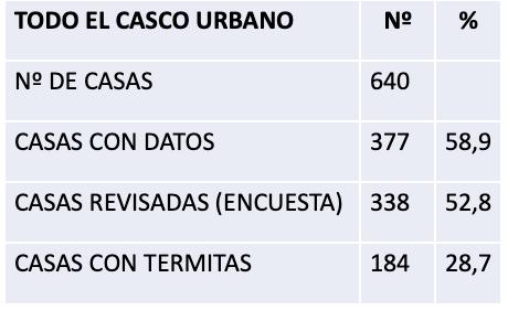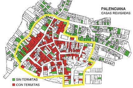 Para ello se efectuó una revisión de las técnicas existentes para controlar las plagas de termitas subterráneas y se analizó su posible aplicación en el casco urbano. Como parte importante para la consecución de este objetivo se realizó una experiencia piloto, financiada por Dow, en el pueblo para la evaluación de la eficacia del biocida inhibidor de la síntesis de quitina y del sistema fabricado por ellos, que fue llevado a cabo por becarios del grupo de investigación bajo las directrices del responsable del proyecto, el Dr. Gaju, y que sirvió para sentar las bases de la intervención global posterior.