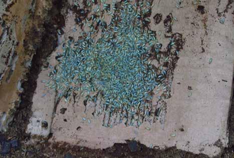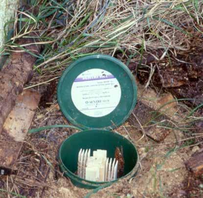 Una vez finalizada la fase de instalación de estaciones, en marzo de 2001 se introdujo el cebo en las mismas (imagen 5), comprobándose que en 6 meses habían ingerido 98 kg de cebo, a partir de esa fecha se constató en las revisiones periódicas posteriores un cese del consumo en las estaciones, dándose por certificada la eliminación de las termitas en la zona tratada en 2005.