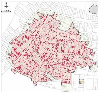 Imagen 5.- Distribución de las estaciones colonizadas por termitas en color rosa y delimitación del área de control de igual color (Tomada de Alcaide, Molero, Diz et.al)