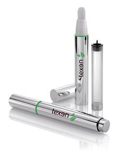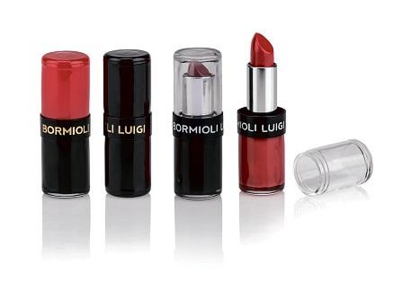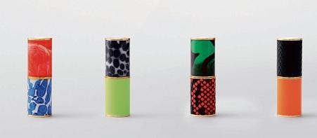 For the refillable lipsticks, the PBt cap and base are decorated to various effect; a malachite print, for example, or a black and red Pu coating the circular zamak lozenge on the cap is galvanized in an aged gold with polished effect and engraved with the brand logo.
