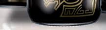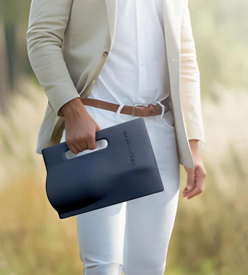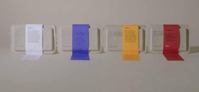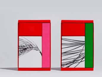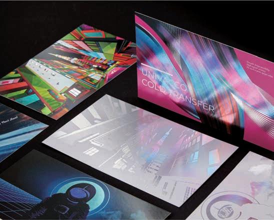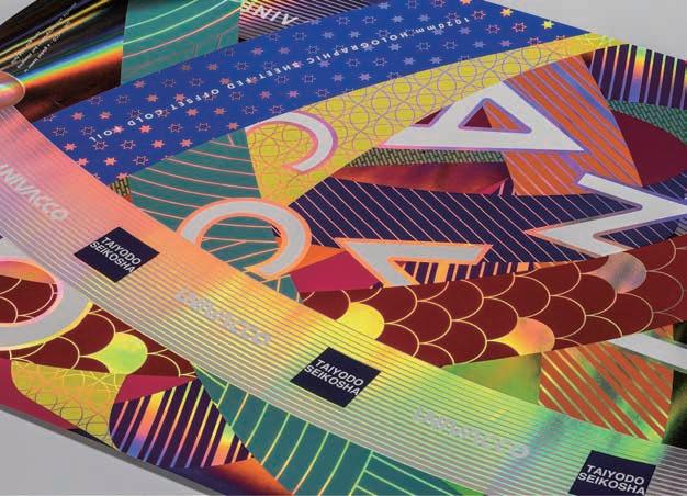 cold transfer film on a 6µm substrate; the patent-pending process reduced the thickness of the substrate by half, thus also minimizing its environmental impact. A hot stamping pass was then applied via the super-matt Luxor/Alufin (26290N) shade. The haptic effects are the result of Hinderer & Mühlich’s multi-level embossing and microstructure clichés.