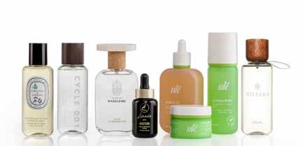 In Japan, Baum (2) (Shiseido) guarantees that 90% of ingredients are of natural origin and uses recycled oak wood scraps to manufacture bottle shells. Most of the bottles are made from biosourced PET or recycled glass.