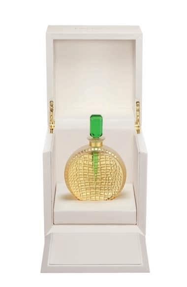 LaLique’s limited-editionempreinte animalefragranceflaconencloses thebrand’ssignaturelalique delaliquefragrance.thesatin bodyisetchedtocreatethetexture ofcrocodileskin,thenenameled ingold.anemerald-greenfaceted crystalstoppersealedwithagolden baudruchagetopstheflacon.the scentcomesinafabric-sheathed woodenboxwithabespokecrocodileskinpatterndoneinreliefonthelid.