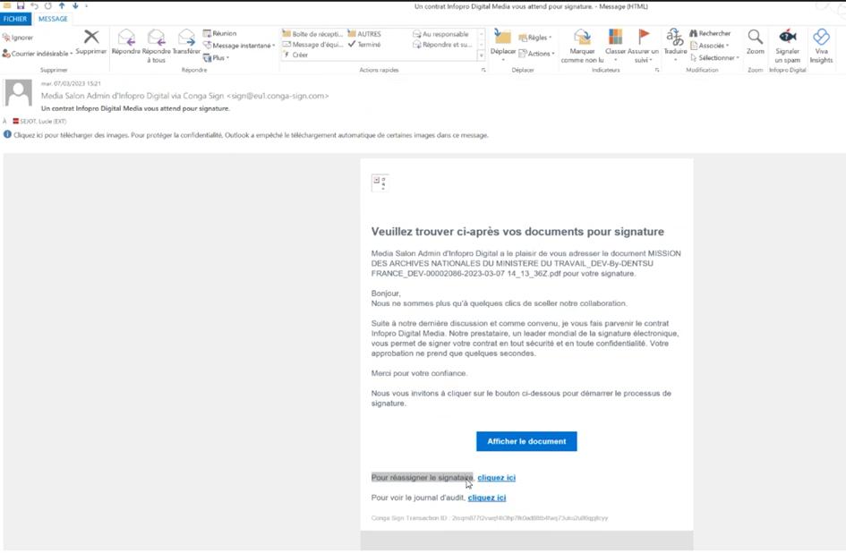 Le message reçu par vos contacts les invitant à signer l'OI