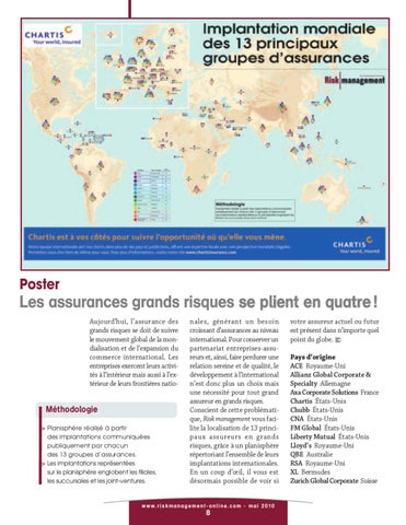 nales, générant un besoin croissant d’assurances au niveau international. Pour conserver un partenariat entreprises-assureurs et, ainsi, faire perdurer une relation sereine et de qualité, le développement à l’international n’est donc plus un choix mais une nécessité pour tout grand assureur en grands risques. Conscient de cette problématique, Risk management vous facilite la localisation de 13 principaux assureurs en grands risques, grâce à un planisphère répertoriant l’ensemble de leurs implantations internationales. En un coup d’œil, il vous est désormais possible de voir si