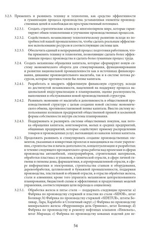 3.2.3. Применять и развивать технику и технологии, как средство эффективности и гуманизации процесса производства; устанавливая элементы производственных цепей и освобождая их пространственный потенциал. 3.2.3.1. Создать стратегические альянсы в многополярном мире, которые гарантируют обмен технологиями и улучшение производственных процессов. 3.2.3.2. Содействовать независимому технологическому развитию исходя из потребностей нашей промышленности, чтобы сделать реальным эффективное использование ресурсов и соответствующие системы цен. 3.2.3.3. Обеспечить единый и непрерывный процесс подготовки работников, чтобы применять технику и технологии, позволяющие сделать более эффективным процесс производства и сделать более гуманным процесс труда. 3.2.4. Создать механизмы обращения капитала, которые сформируют новую систему экономического оборота для стимулирования, функционирования и развития национальной промышленности как в источниках финансирования, динамике производительного масштаба, так и в системе потока ресурсов, которые противостояли бы логике капитала. 3.2.4.1. Разработать и внедрить эффективную финансовую структуру, исходя из достигнутой независимости, нацеленной на поддержку процесса национальной индустриализации в планировании, оценке реализуемости, выполнения и обслуживания новой производственной структуры. 3.2.4.2. Развивать экономию от масштаба и дополняемость в общественной производственной структуре с целью создания новой системы экономического обмена, противопоставляемой логике капитала. Ввести систему использования излишков предприятий общественной прямой и косвенной формы собственности внутри системы планирования. 3.2.4.3. Поддерживать и расширять системы общественных покупок, как потока обращения капитала, конгломератов, малых и средних предприятий, общинных предприятий, которые содействуют прямому распределению товаров и произведенных услуг, вытекающих из каналов логики капитала. 3.2.5. Продолжить развивать и стимулировать создание производственных элементов, указанных в конкретных проектах и находящихся на этапе укрепления, строительства и начала деятельности, концептуализации и разработки; в течение следующего президентского срока работы над проектами в сферах производства автомобилей, электроприборов, строительных материалов, обработки пластмасс и упаковок, в химической отрасли, в сфере личной гигиены и гигиены дома, фармацевтики, в агропромышленной отрасли, в сфере информатики и электроники, строительства станков и оборудования, деревообработки, целлюлозной и бумажной промышленности, поддержки производства, текстильной и обувной отрасли, в отрасли обработки железа, стали и алюминия; кроме того управлять механизмом централизованного планирования, бюджетной схемы и эффективных и продуктивных моделей управления, соответствующих цели перехода к социализму. 3.2.5.1. Обработка железа и литье стали — поддержать следующие проекты: a) Фабрика по производству стержней и пластин из стали «SIDOR», штат Боливар; b) Фабрика по производству стержней «SIDETUR», штаты Боливар, Лара, Карабобо и Столичный округ; c) Фабрика по производству минерального железа «Ферроминера дель Ориноко», штат Боливар; d) Фабрика по производству и ремонту нефтяных клапанов «Инвеваль», штат Миранда; e) Фабрика по производству ко