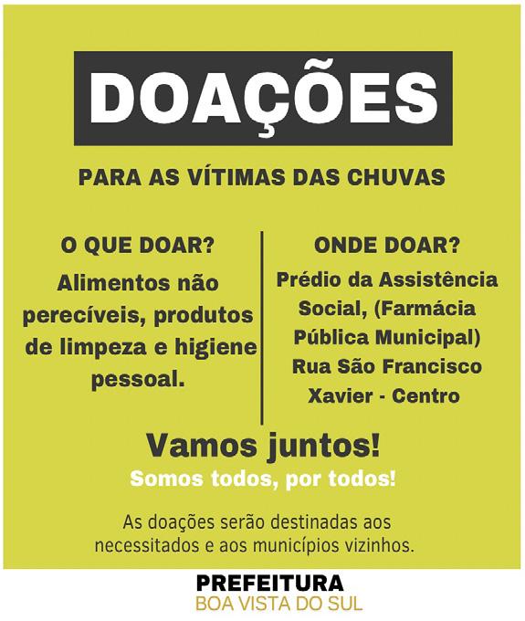 que tenham responsabilidade com a população e com o dinheiro público. Manaila Brambilla Guaragni (Progressistas) prestou sua solidariedade e pesar a todos os atingidos pela enchente. Agradeceu as ajudas recebidas e suplicou para que as doações não parem. Ela finalizou explicando o programa “Adote uma Cidade”, ação que visa a recuperação das cidades atingidas com ajuda financeira e força de trabalho enviada por municípios menos afetados, sugerindo que o município de Boa Vista do Sul use o exemplo e ajude as cidades vizinhas que foram devastadas.