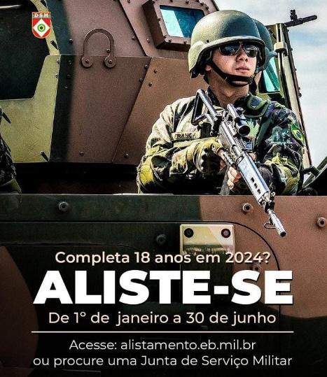 Alistamento militar - O alistamento é obrigatório para todo brasileiro masculino, sendo realizado no ano em que completa 18 anos (nesse ano o alistamento é para os nascidos em 2006). O alistamento online é uma opção somente para quem completa 18 anos e estará disponível até o dia 30 de junho. Para fazer seu alistamento online, é necessário o cadastro na plataforma “gov.br”. Caso já possua esse cadastro, basta se alistar na página do alistamento.