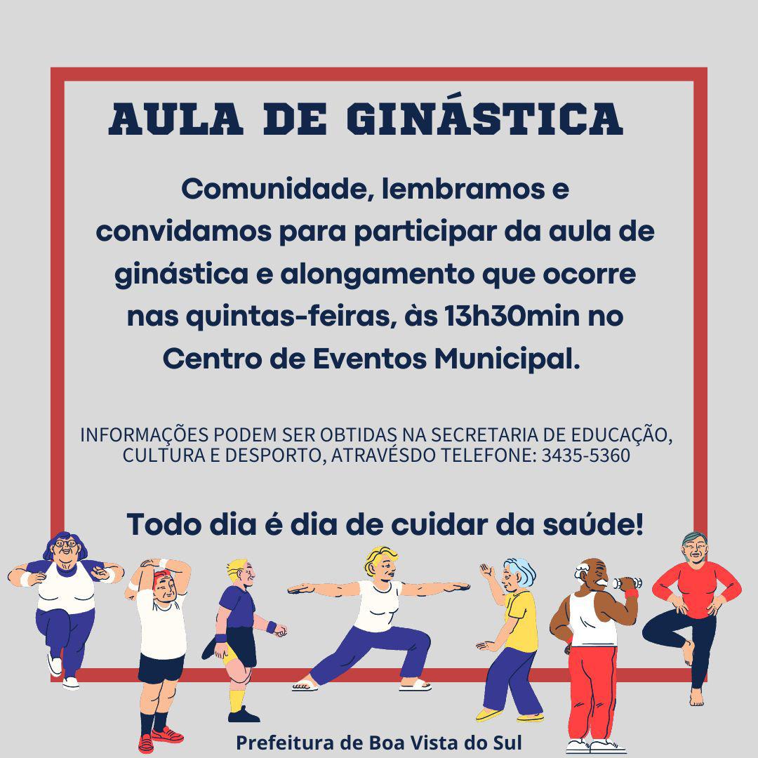 Com o intuito de cuidar da saúde e do bem-estar, convidamos e lembramos a comunidade boavistense que nas quintas-feiras ocorrem aulas de ginástica e alongamento, às 13h30, no Centro de Eventos Municipal, com a professora Cristiane Bristot. Integrando o Projeto Arte e Felicidade e pensando nos benefícios, tanto físicos quanto mentais e emocionais, os movimentos ajudam a ter uma vida mais saudável. Não podemos deixar de fora um dos benefícios mais importantes: a longevidade. Ao incluir a ginástica e o alongamento