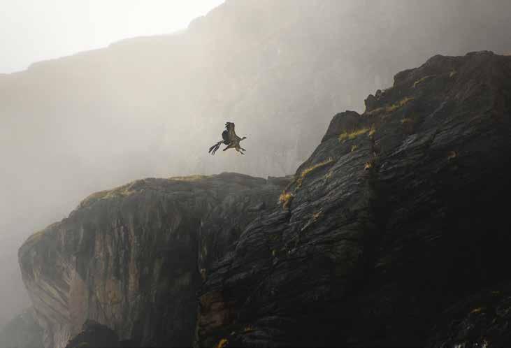 C’était à la fin de l’été, je cheminais vers le refuge du Fond des Fours, à Val d’Isère, lorsque j’ai aperçu ce vautour. Il avait du mal à prendre de l’altitude, faute de thermiques. La matinée était fraîche, les dernières brumes donnant une ambiance mystérieuse. À sa tentative suivante, il a réatterri dans les pentes herbeuses, sautillant alors sur ses pattes avec un air pataud. J’aime particulièrement ce grand rapace, majestueux et puissant en vol, que l’on aperçoit de mai à septembre en Tarentaise. Il vient ici en quête de nourriture et de charognes, suivant l’estive des troupeaux. Chaque jour, il parcourt des distances incroyables…