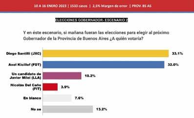 De acuerdo con la citada investigación, si las elecciones para gobernador bonaerense se realizaran mañana, el 33,1 por ciento votaría a Diego Santilli (Juntos), mientras que Kicillof (Frente de Todos) obtendría el 32% de los votos. Como tercera opción, 10% los consultados elegirían a "un candidato de (Javier) Millei" de La Libertad Avanza.