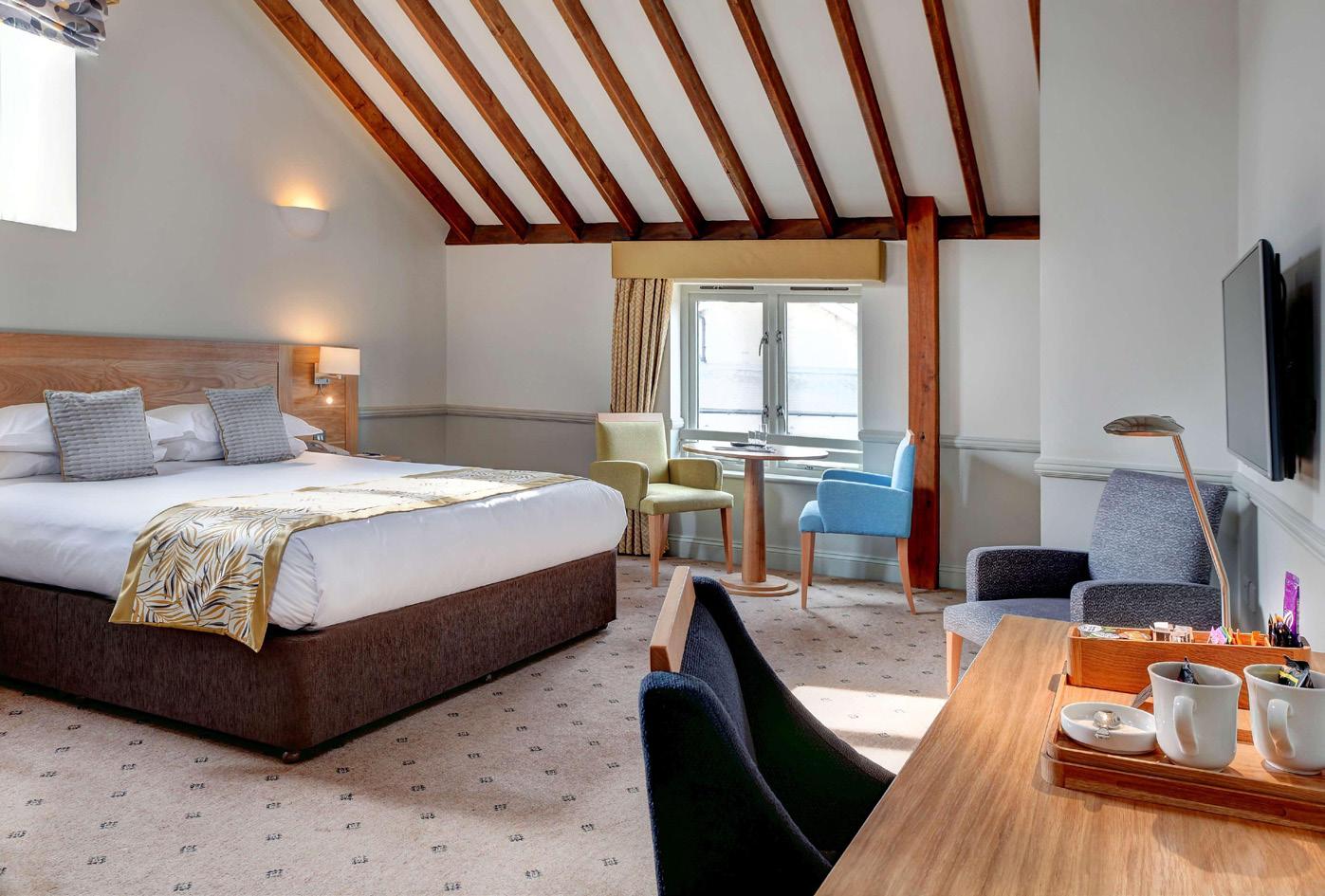 A combination of deluxe double and twin rooms are available, each equipped with an en-suite bathroom, flat-screen TV, electric kettle, and conveniently placed plug sockets next to the beds.