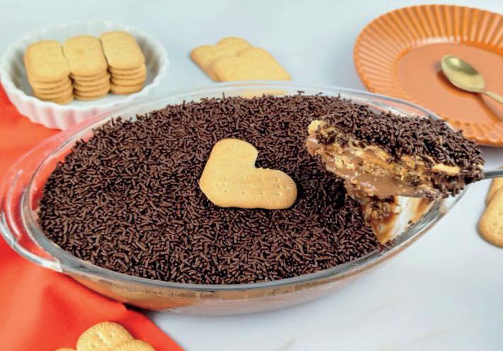 Em uma panela, coloque o leite condensado, o chocolate e a manteiga. Leve ao fogo médio e mexa sem parar por 8 minutos, até obter um brigadeiro que desgrude do fundo da panela; Desligue o fogo, acrescente o creme de leite e mexa. Reserve; Coloque o conhaque em um prato e pegue uma travessa média; Mergulhe as bolachas no conhaque e forre todo o fundo da travessa; Espalhe 1/3 do brigadeiro por cima e cubra com uma camada de bolachas umedecidas. Espalhe mais 1/3 do brigadeiro e cubra com outra camada de bolachas; Finalize com o restante do brigadeiro e decore com granulados. Leve a travessa à geladeira por 2 horas; Retire e sirva.