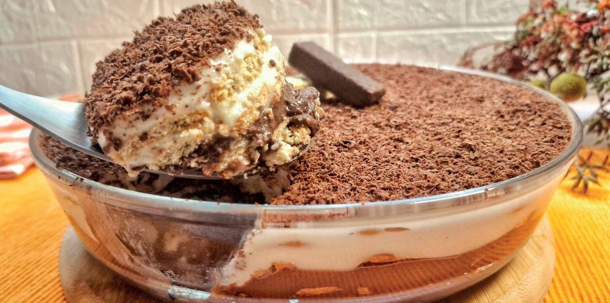 Em uma panela fora do fogo, junte o leite e o amido de milho. Misture bem. Acrescente o leite condensado, o creme de leite e mexa novamente; Ligue o fogo médio e continue mexendo por 10 minutos; Reduza para o fogo baixo e continue mexendo até ficar cremoso. Transfira metade desse creme para um recipiente e reserve; Na metade do creme que ficou na panela, dissolva o chocolate em pó. Em uma travessa, despeje metade do creme de chocolate e espalhe por todo o fundo; Molhe os biscoitos no leite e faça uma camada por cima do creme de chocolate; Depois, coloque o restante do creme de chocolate e mais uma camada dos biscoitos umedecidos. Despeje metade do creme branco, uma última camada de biscoito, finalize com o restante do creme branco e leve para a geladeira por cerca de 2 horas; Peneire chocolate no centro da travessa e sirva!