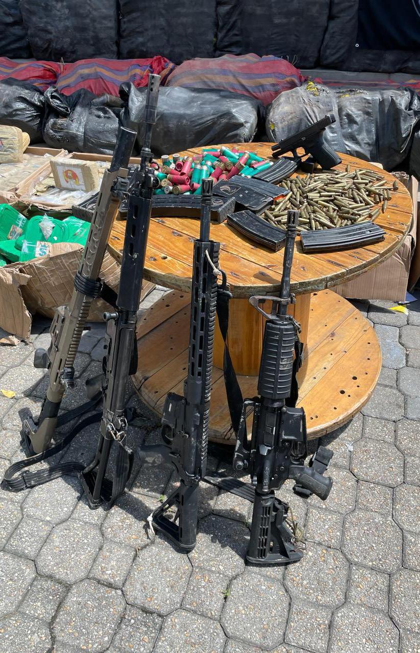 Na ocasião, as equipes policiais apreenderam, no bairro Nossa Senhora de Fátima, um arsenal com 36 armas de grosso calibre, sendo 31 pistolas de vários modelos e calibres, quatro fuzis de calibre 5.56, uma submetralhadora de calibre 40, além de 63 carregadores de pistola 9 milímetros, três carregadores modelo caracol, 24 carregadores de fuzil calibre 5.56, um carregador de submetralhadora calibre 40 e 95 munições de calibre 5.56