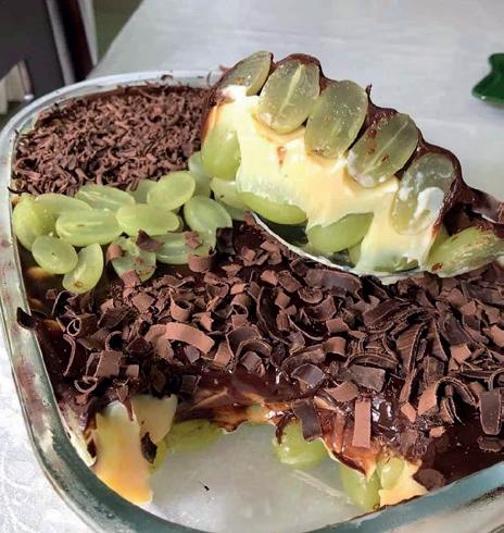 Solte as uvas do cacho, lave-as, seque bem e reserve. Em uma panela, coloque o leite condensado e a margarina e leve ao fogo médio mexendo sempre até soltar do fundo da panela. Deixe esfriar, adicione 1/2 caixinha de creme de leite e reserve. Em uma panela, quebre o chocolate em pedaços e leve ao fogo em banho-maria até que esteja completamente derretido. Acrescente o creme de leite e misture bem. Em um refratário, coloque todo o creme branco, forre o creme com as uvas e despeje a ganache de chocolate por cima. Leve à geladeira, decore como desejar e sirva gelado.