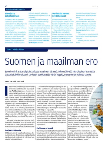 nfrarakentamisen digitalisoimiseen erikoistuneen Infrakitin myyntijohtaja Pasi Joensuu sanoo Suomen olevan digitalisaatiossa kymmenen vuotta muuta Eurooppa edellä, vaikka vielä joitakin vuosia sitten kentällä ihmeteltiin alan hidasta ja jopa mahdottomana pidettyä kehitystä – ”kun eihän siellä kaikki yritykset käytä edes sähköpostia”. ”Kymmenen vuotta on provosoivasti sa nottu, mutta se on lukuna paljon lähempänä kuin vuosi tai kaksi. Edistyksellisyyttä ei voi mitata yhdellä mittarilla, mutta mittakaava on oikea. Meiltä löytyy oikeasti maailmanluokan meininkiä”, Joensuu to teaa. ”Olemme edistyksellisiä etenkin siinä, miten digitalisaatio on tuotu työmaille hyödynnettäväksi. Ruotsi ja Norja ovat lähellä, mutta muut eivät ihan vielä nurkan takana.”
