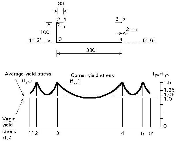 Las propiedades mecánicas del acero en la zona de las esquinas cambia de manera significativa debido en mayor medida a que reciben mas esfuerzo durante el proceso de doblado. Se tiene entonces un incremento en el esfuerzo de fluencia y de la tensión ultima , pero este ultimo fys Fu en menor medida, por tanto, se reduce de manera significativa la ductilidad del perfil. Las partes planas también sufren una incremento del esfuerzo de fluencia y de tensión ultima, pero en menor medida al incremento originado en las esquinas.
