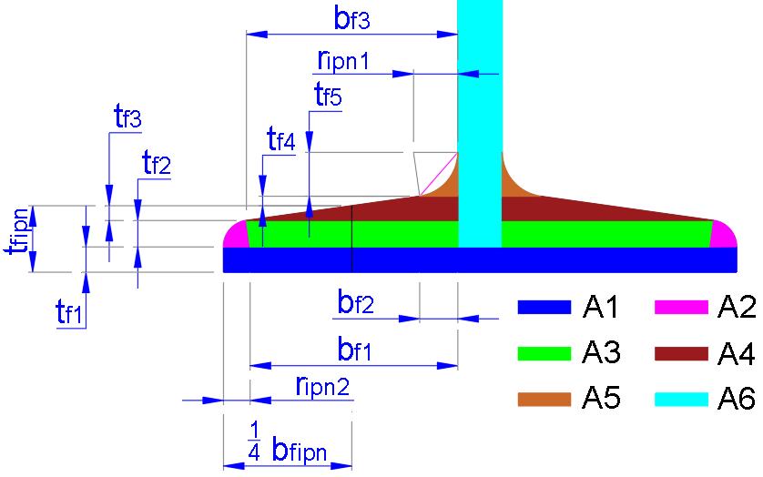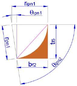 STEELDESIGN04.PropiedadesgeométricasdevigasIconalas desecciónvariable Página 5 de 16 byIng.AngelManrique Dimenciones Área A2 Ángulodeinclinacióndelasalas % 14 »f deg 7.97 atan »f »fipn1 deg 82.03 »fipn1 deg 90 »fipn2 Alturadelárea mm 6.44 cos »fipn1 ripn2 tf2 Figura3.AreaA2 Dimenciones Área A3 Alturadelárea mm 6.44 tf2 ripn2 2 twipn bfipn bf1 Basemenor mm 50.6 bf1 Figura4.AreaA3 mm 51.5 sin »fipn1 1 ripn2 2 twipn bfipn bf3 Basemayor Dimenciones Área A5 Ángulodeinclinacióndelasalas % 14 »f deg 7.97 »fipn1 deg 82.03 »fipn2 Alturaelárea mm 10.7 cos »fipn1 ripn1 tf5 Basedelárea sin »fipn1 1 ripn1 bf2 mm 9.3 bf2 Figura5.AreaA5 Dimenciones Área A4 Ángulodeinclinacióndelasalas % 14 »f deg 7.97 »fipn1 deg 82.03 »fipn2 Basemayor mm 51.5 bf3 Figura6.AreaA4 Basemenor mm 9.3 bf2 sin »fipn1 1 ripn2 bfipn 4 1 tan »fipn1 tf3 Alturas mm 3.59 tf3 mm 2.32 tf3 bf2 bf3 tan »fipn1 tf4