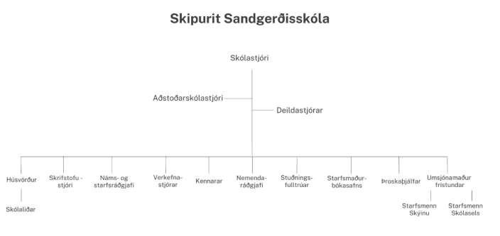 Bylgja Baldursdóttir skólastjóri: Starfsmannamál, ráðningar eða breytingar í starfi, tilkynningar forfalla og leyfisveitingar. Hún sér um launamál, stundatöflur, rekstur Sandgerðisskóla, Skólasels, Skólabókasafns og eftirskólaúrræðisins Skýisins. Sér um skýrsluog áætlanagerð sem og innra mat. Bylgja er tengiliður við stjórnsýslu, nefndir og ráð á vegum sveitarfélagsins og aðrar stofnanir. Bylgja aðstoðar kennara við Mentor og vitnisburði, hún skipuleggur dagskrá kennarafunda