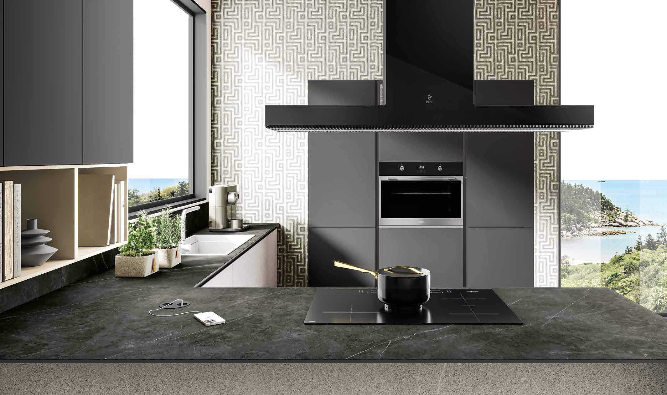 To match the fronts, the composition boasts a snack counter on the island equipped with the NikolaTesla induction hob with integrated suction.
