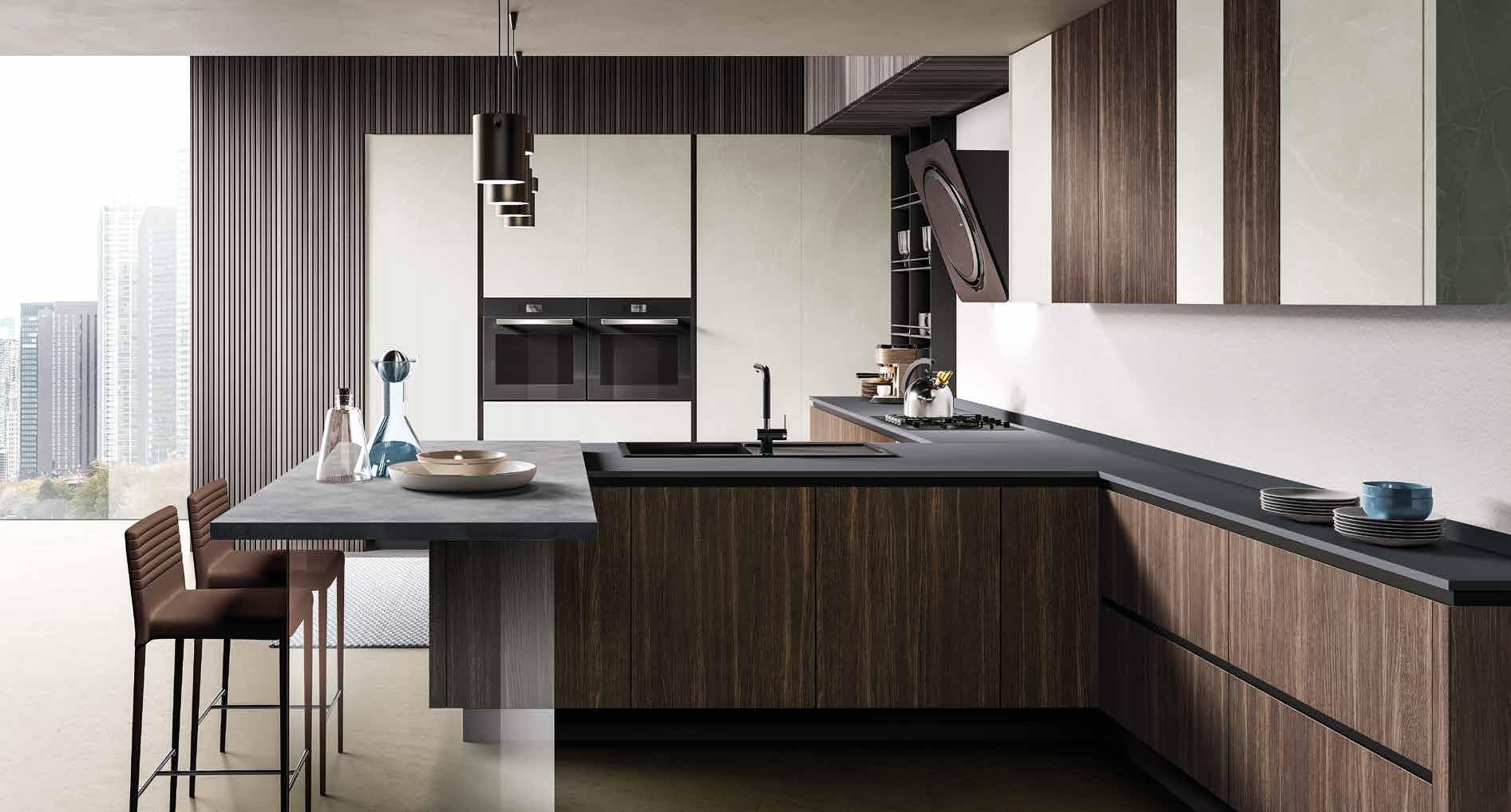 Traccia una “L” nell’ambiente cucina, l’isola raffigurata, impreziosita dai fianchi di rifinitura laterali, spessi ben 5,2 cm. e dai cassetti nella tonalità alevè artico che fungono perfino da fascia decorativa nel gradevole connubio col vetro piombo opaco.