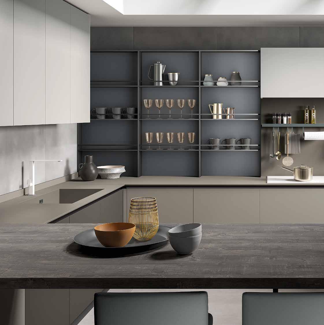 The island shown here forms the shape of an L in this kitchen, embellished with décor side panels, a generous 5.2 cm thick, and drawers in alevè artico colour which also work like a decorative band in the attractive combination with matt piombo glass.