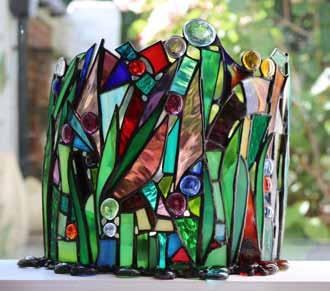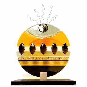pictured from top – column 1: Sue Collins, Fern Fantasy, mixed media; Gina Lelliott, Melody, fused glass; Gabrielle Lord, Dancer with Red Hair, acrylic on board; col 2: Eva Wibberley, Forever and a Day, oil on paper; Diane Bailey, Together Again, acrylic on board; Lyndsey Smith, Early Start Smithfield, pen & watercolour; col 3: Nicola Colbran, Barn Owl in Flight, watercolour; Lindsey Pearson, Water’s Edge, watercolour; Yolande Beer, Decorative Figure Dish; Janice Thurston, Lockdown View Three Cornered Copse, Oil; col 4: Jane Bridger, Raku Bat Pot; Joan Wilkes, Funky Breakfast, card print and paint; above: Claudia Wiegand, Saturn, fused glass sculpture; below: Nichola Campbell, Theatre at Daybreak, ink on wood panel.