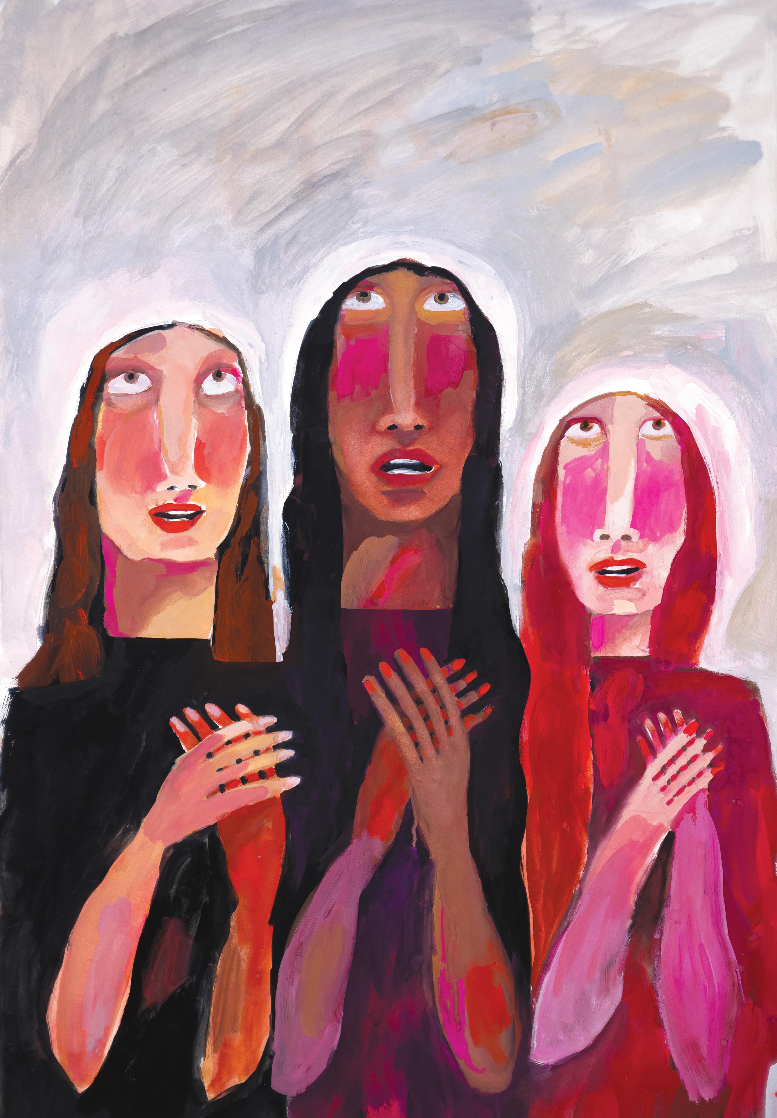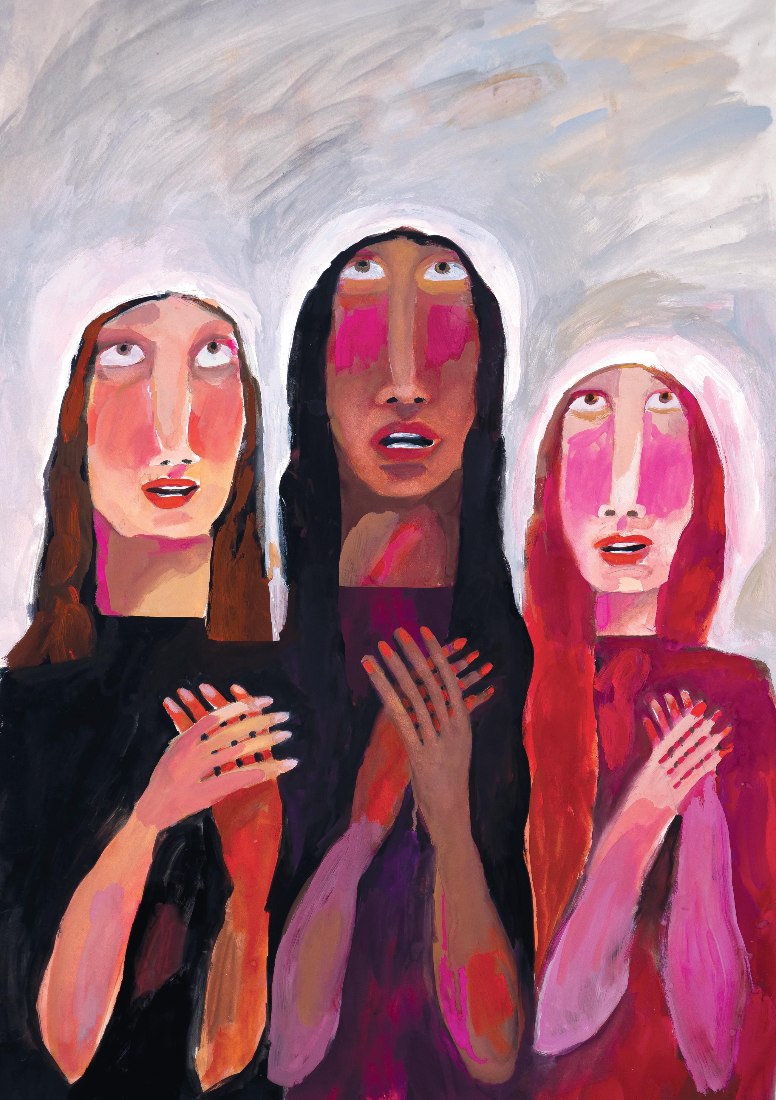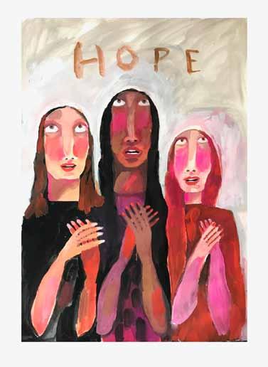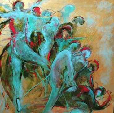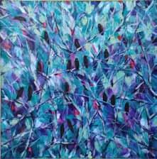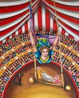 from top: Anna Towner, The Trapeze Artist, oil on linen; Libbi Gooch, Scattering Seeds, oil on canvas; Carole Robson, Red Sun, digital mixed media; Felicity Flutter, Translucent, watercolour and graphite pencil