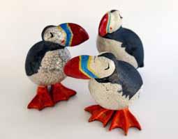 We’ve recently welcomed a new member, Chris Hesketh, who specialises in ceramic sculptures. Her favourite subjects are birds and animals, which are hand built using a white, molochite based clay, which will withstand the rigours of Raku firing and will also fire to stoneware. With the stoneware pieces, she uses washes of underglazes and the occasional spot or two of clear glaze to accentuate eyes and other features.
