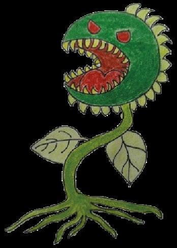 Descripción física: Una planta enorme con un tallo serpenteante, hojas filosas y una boca llena de colmillos. Sus ojos brillan con un destello rojo venenoso.