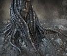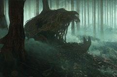 intimidante con ojos rojos y colmillos afilados. Su cuerpo es una fusión entre raíces y tentáculos, con esporas venenosas flotando a su