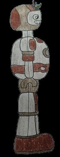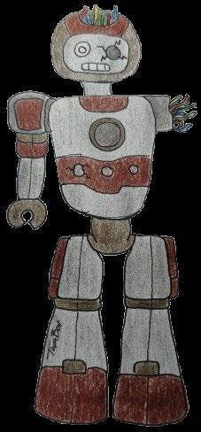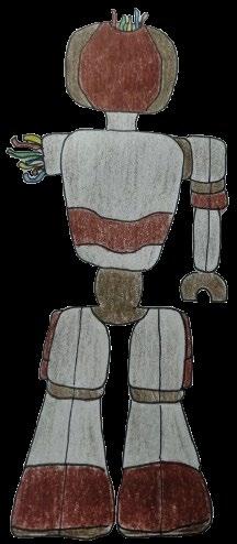Un robot con un diseño steampunk, desgastado por el tiempo. Su cuerpo tiene espacios vacíos donde faltan piezas. Al inicio, se ve incompleto y vulnerable, pero a medida que avanza en su