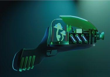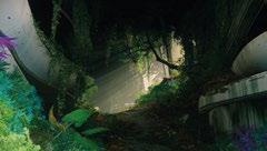 En el centro del bosque, un enorme HONGO ROBÓTICO bloquea su camino. Con dificultad, lo derrota y accede a una CUEVA LUMINISCENTE.