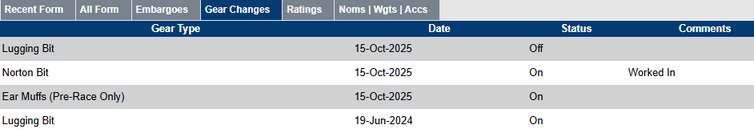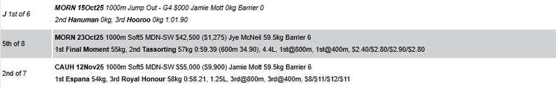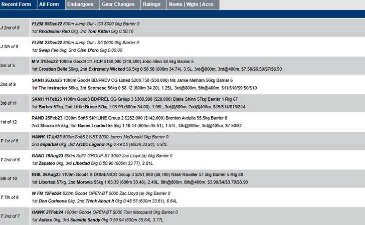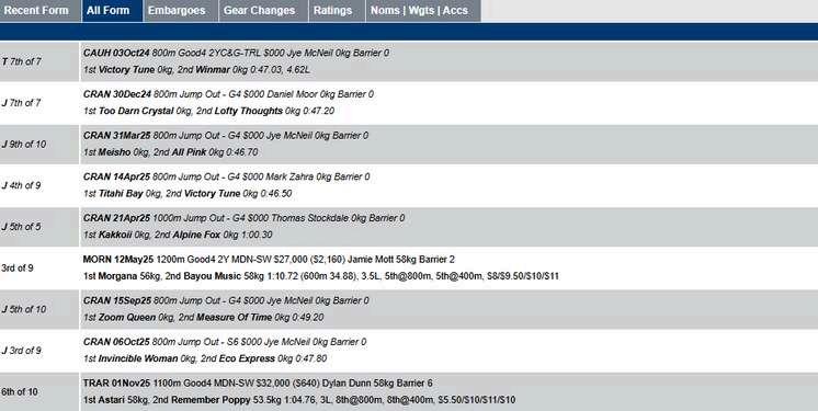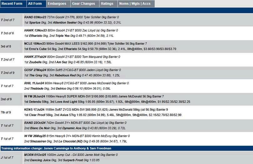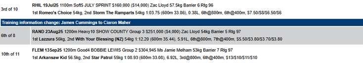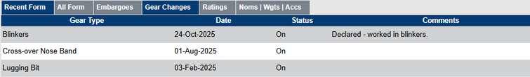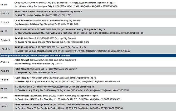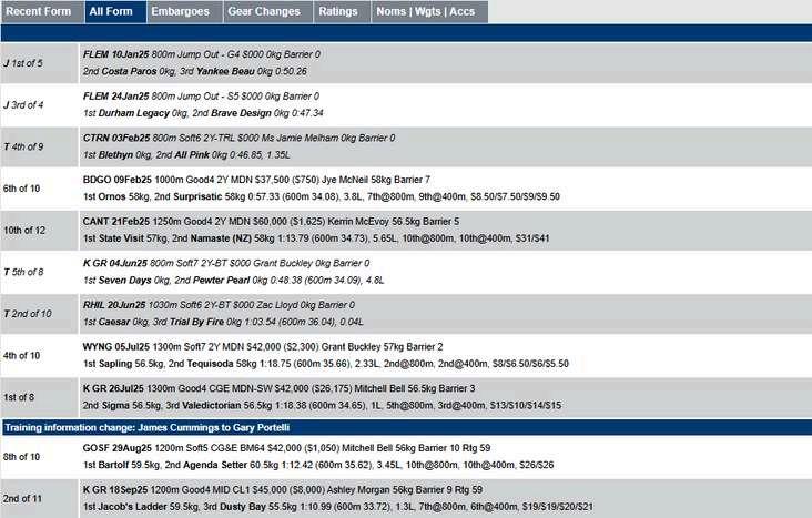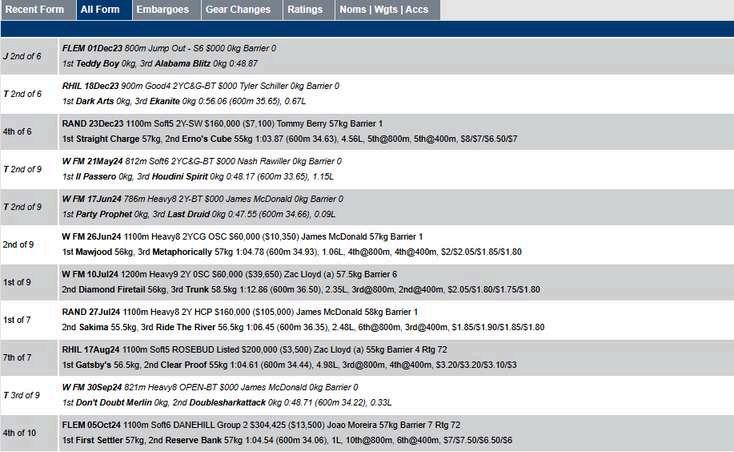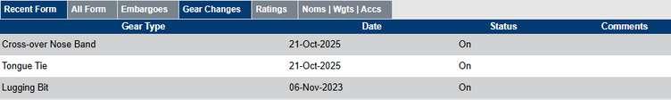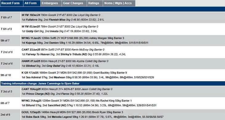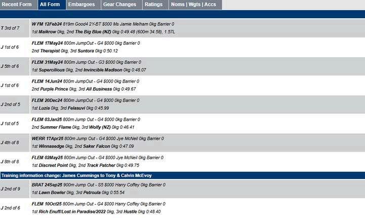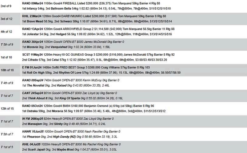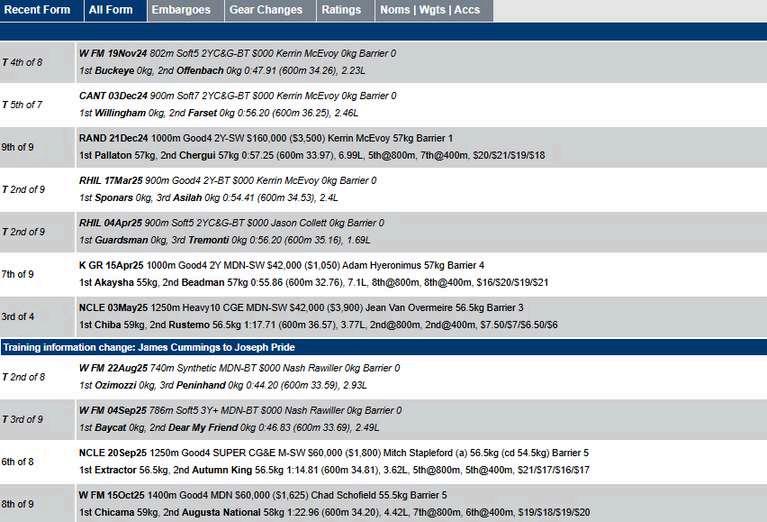 TRAINER: OWNER: CAREER: PRIZEMONEY: In Training since 25/03/2025 69 16.0