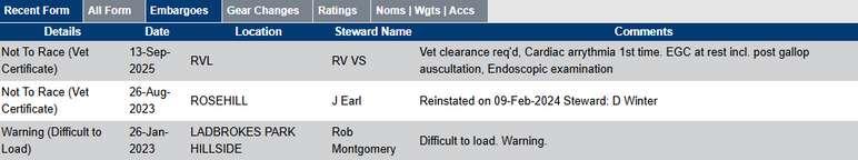 Current embargo following race Sep 13 - Veterinary clearance required following cardiac arrythmia first time. ECG at rest including post-gallop auscultation, endoscopic examination. ECG report performed Nov 11 and report included indicating return to normal rhythm.