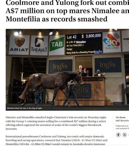 One of the priciest broodmares ever sold at an Australian auction has broken records at the Inglis Chairman’s Sale in what the industry sees as a sign of a booming market. Group 1 winner Nimalee was bought by Colm Santry Bloodstock and Coolmore Australia for $3.6m, setting an Inglis Chairman’s Sale record at Warwick Farm.