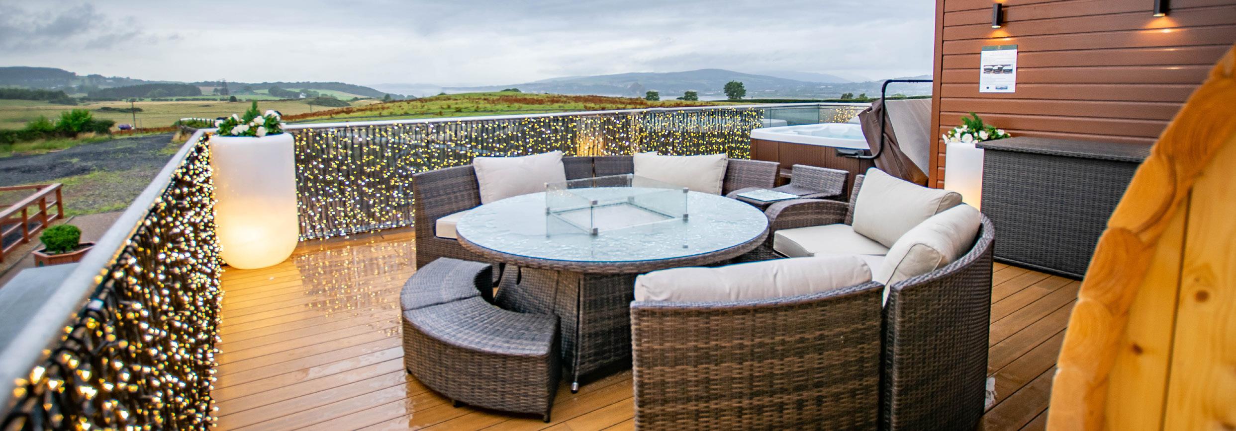 Our West Terrace is located on the second floor of our boutique hotel. It is a private terrace with stunning views of the countryside and River Clyde. With a hot tub, sauna and seating for up to 6 guests, our West Terrace can be added to your booking whether that be for the day or for a private event.