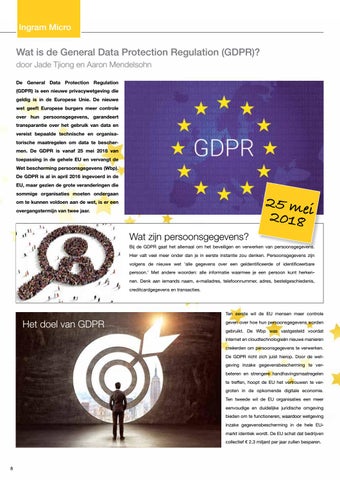 Wat is de General Data Protection Regulation (GDPR)? door Jade Tjiong en Aaron Mendelsohn De General Data Protection Regulation (GDPR) is een nieuwe privacywetgeving die geldig is in de Europese Unie. De nieuwe wet geeft Europese burgers meer controle over hun persoonsgegevens, garandeert transparantie over het gebruik van data en vereist bepaalde technische en organisatorische maatregelen om data te beschermen. De GDPR is vanaf 25 mei 2018 van toepassing in de gehele EU en vervangt de Wet bescherming persoonsgegevens (Wbp). De GDPR is al in april 2016 ingevoerd in de EU, maar gezien de grote veranderingen die sommige organisaties moeten ondergaan om te kunnen voldoen aan de wet, is er een overgangstermijn van twee jaar.