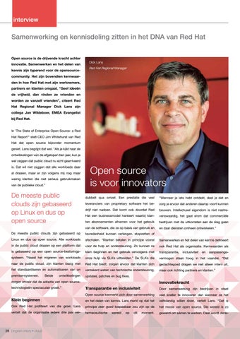 community. Het zijn bovendien kernwaarden in hoe Red Hat met zijn werknemers, partners en klanten omgaat. “Geef ideeën de vrijheid, dan vinden ze vrienden en worden ze vanzelf vrienden”, citeert Red Hat Regional Manager Dick Lans zijn collega Jan Wildeboer, EMEA Evangelist bij Red Hat. In 'The State of Enterprise Open Source: a Red Hat Report'* stelt CEO Jim Whitehurst van Red Hat dat open source bijzonder momentum geniet. Lans begrijpt dat wel. “Als je kijkt naar de ontwikkelingen van de afgelopen tien jaar, kun je wel zeggen dat public cloud nu echt gearriveerd is. Dat wil niet zeggen dat alle workloads daar al draaien, maar er zijn volgens mij nog maar weinig klanten die niet serieus gebruikmaken van de publieke cloud.”
